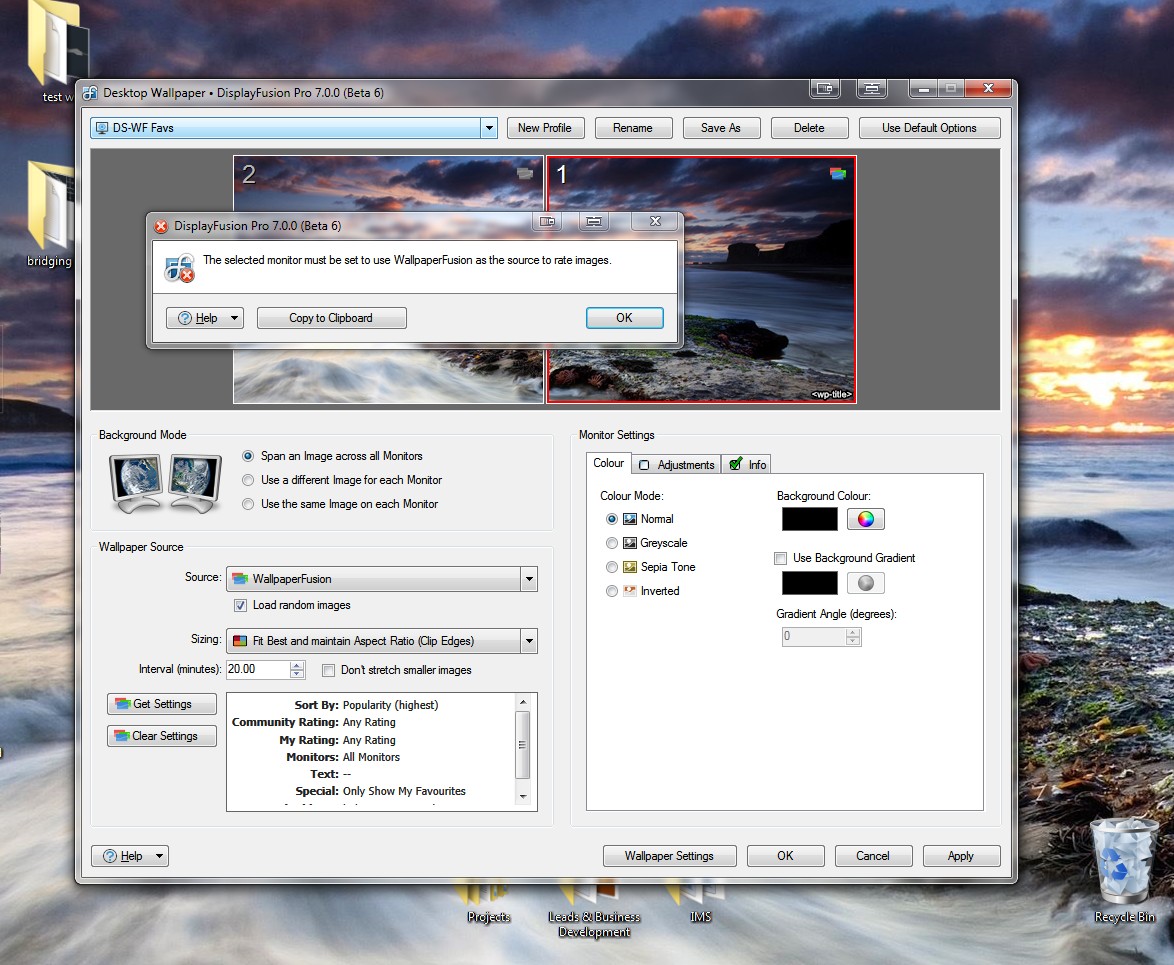 Hi Keith, I didn't realize that this feature was added. I tried it out and I'm having the same issue too. I tried it on both monitors but got the same error message "The selected monitor must be set to use WallpaperFusion as the source to rate images." but I do have WF as the source (see attachement).